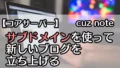 これまでは本雑記ブログ(cuz note)と、マッチ3Dというゲームの攻略ブログ(マッチ3D攻略 研究所)の2つを作ってましたが、新しいブログを作ることにしたので手順やメモなどを記録しておきます。 レンタルサーバーとドメインの契約があればサブドメインは簡単に追加できるのでオススメです。