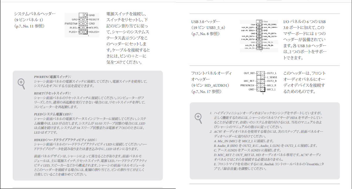 p21、p23 にパネルヘッダー、AUDIO、USB3.0 の詳細が載ってました。
